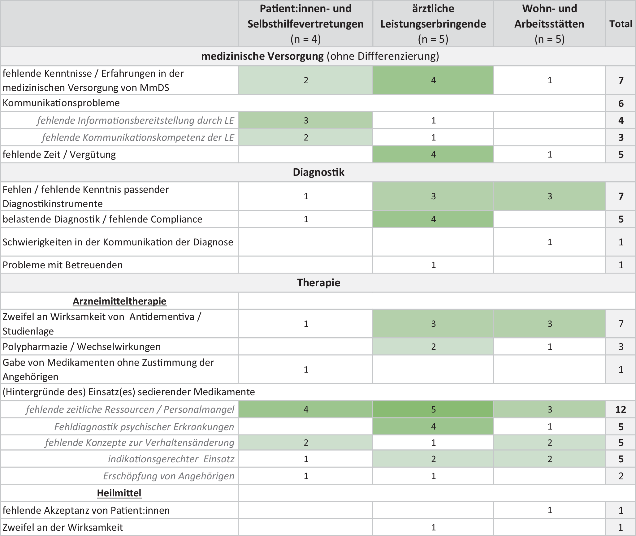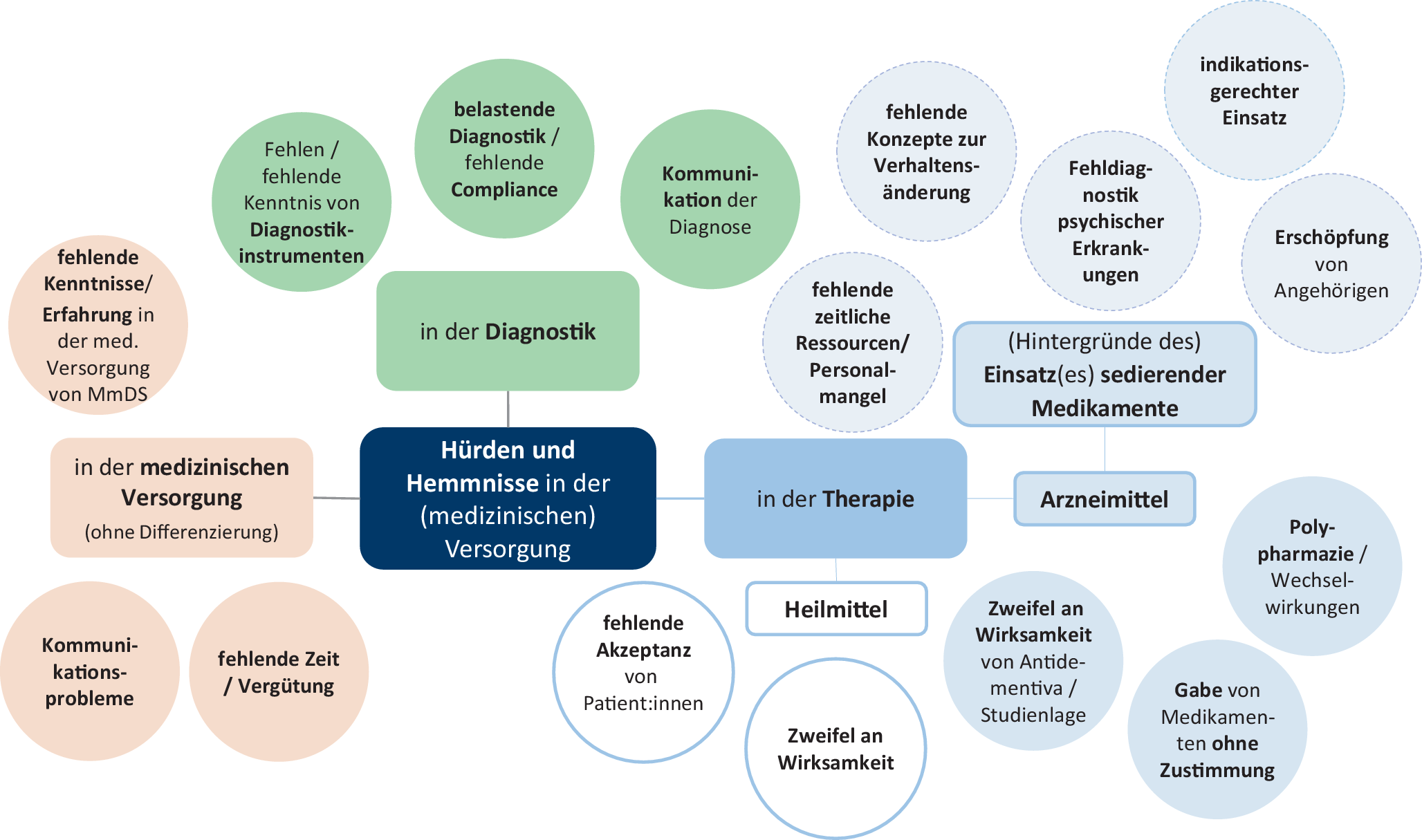 Fehlende Kenntnisse und Erfahrungen von Ärzt:innen im Umgang mit sowie in der medizinischen Versorgung von MmDS zeigten sich als zentrale Herausforderung. Zudem ist die Diagnostik der Demenz bei MmDS aufgrund verschiedener Ursachen (u. a. Fehlen geeigneter Diagnostikinstrumente in der Regelversorgung, fehlende zeitliche/finanzielle Ressourcen) erschwert. Zweifel an der Wirksamkeit von Antidementiva wurden geäußert sowie Hintergründe für einen erhöhten Einsatz sedierender Medikamente diskutiert.