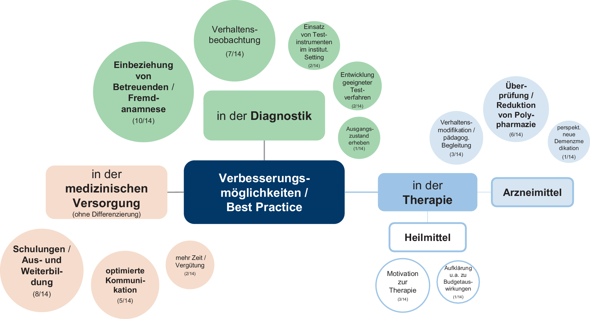 Verbesserungsmöglichkeiten und Best-Practice-Ansätze in der medizinischen Versorgung von MmDS und Demenz. (Quelle: eigene Darstellung)