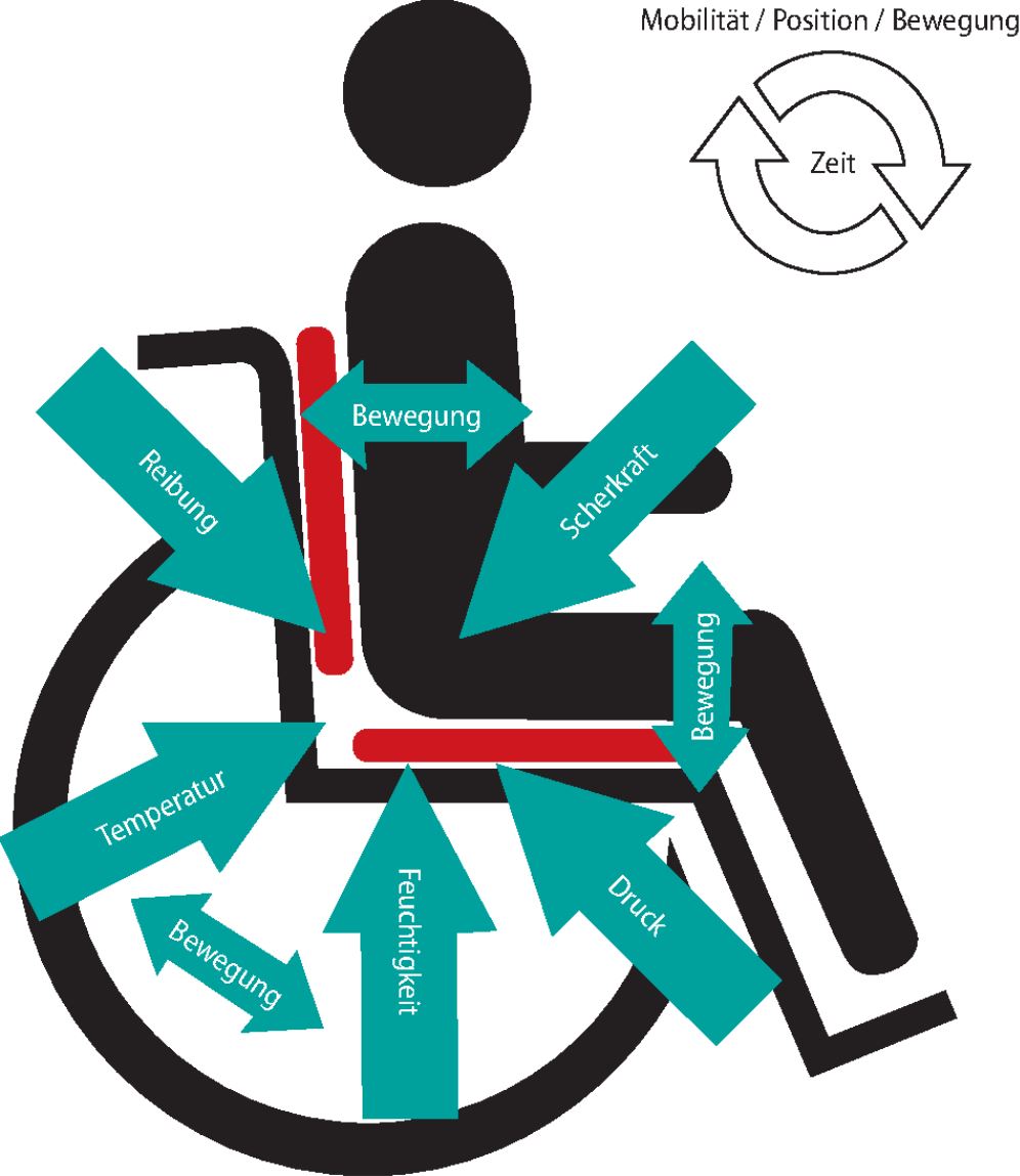 Innovative Hilfsmittel beeinflussen physikalische Risikofaktoren. Moderne Sitzhilfen zeichnen sich dadurch aus, dass sie möglichst anpassbar sind und individuelle Risikofaktoren aufgreifen. Beim Sitzen im Rollstuhl wird dies an den Kissen und Rückensystemen deutlich.