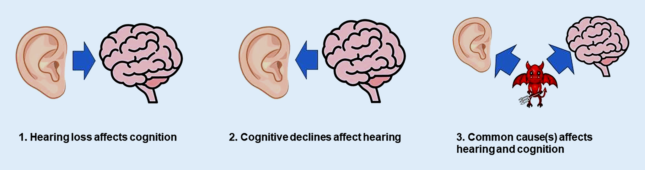 But an alternative explanation for hearing loss being associated with cognitive decline and risk of dementia is that cognitive declines impact hearing [14]. Listening is cognitively demanding [15]. Someone might have hearing problems due to cognitive decline, rather than hearing affecting cognition.