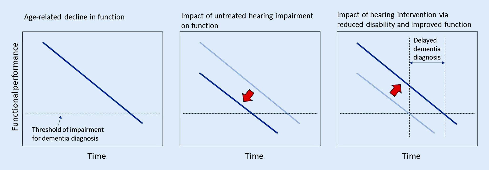 Impact of untreated hearing impairment and benefits for hearing intervention on function and progression to dementia. Dark and light blue lines indicate trajectories of functional decline with age-related changes in cognition
