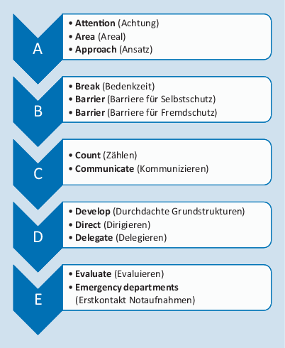In der Abarbeitung diverser präklinischer und klinischer Notfallszenarien hat sich weltweit das ABCDE-Schema bewährt, welches eine einfach zu erinnernde Reihenfolge der Priorisierung von Untersuchung und Therapie bietet. Die Autoren haben, basierend auf den durchgeführten Einsätzen, in der gemeinsamen Diskussion ein aus einfachen englischsprachigen Begriffen bestehendes ABCDE-Schema für das ersteintreffende Fahrzeug beim Großschadensfall entwickelt. Dieses ist einerseits einfach zu erinnern, andererseits so umfassend, dass die Anfangszeit vor Ort damit vollständig zu bearbeiten ist.