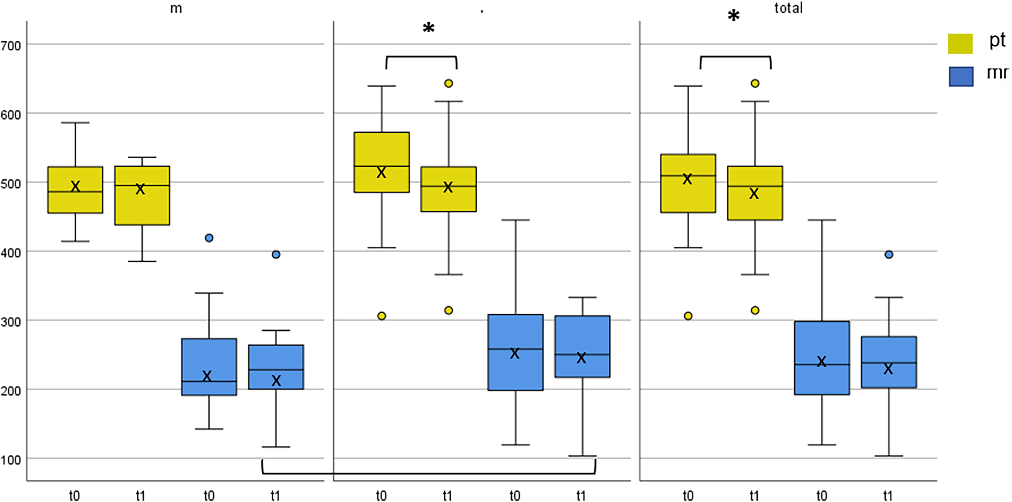 Processing time and motor response. Time (pt) and motor response (mr) in ms (Y-axis) of men (n = 30) and women (n = 30) and as a total (n = 60) of baseline (t0) and post-test (t1), during the selection response condition (RTS4). * p < 0.05 (statistically significant)