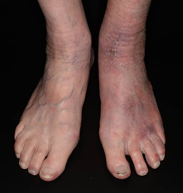 Auf eine chronische Veneninsuffizienz (CVI) ist der größte Teil der Beingeschwüre zurückzuführen. Meist entsteht die Insuffizienz postthrombotisch. Das dermatologische Bild besteht anfangs aus einer Corona phlebectatica am Plantarrand und einem ödematösen Knöchelbereich. Darauffolgend können Hyper- und Depigmentierungen, eine Atrophie blanche, Stauungsekzeme oder trophische Störungen mit Indurationen (Abb. 2) entstehen. Auch Störungen des Nagelwachstums mit Onychomykosen sind möglich [32]. Therapiert werden kann die CVI mittels Bandagen bzw. Kompressionsstrümpfen, um den venösen Rückfluss zu unterstützen. Zusätzlich kann/können eine antiseptische Therapie oder Glukokortikoide angewendet werden. Das nicht allzu schmerzhafte Ulcus cruris stellt die häufigste Komplikation dar, welches meist am distalen Unterschenkel, im Bereich des medialen Knöchels, entsteht [7].