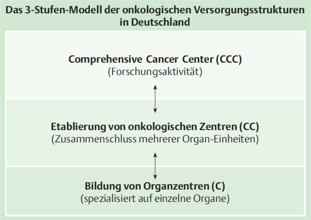 Die Versorgung onkologischer Erkrankungen erfolgt in Deutschland innerhalb eines dreistufigen Zentrenmodells (siehe Abb. 1). Die Organkrebszentren bilden die Basis dieses Modells. Hier erfolgt die Behandlung des Tumorleidens organspezifisch. Der Zusammenschluss mehrerer Organkrebszentren unter Mitwirkung organübergreifender Fachdisziplinen, z. B. Radiologie und Radioonkologie, Psychoonkologie und Palliativmedizin, wird onkologisches Zentrum oder auch Cancer Center genannt. Hier erfolgen außerdem Tumordokumentation und Tumorkonferenzen. Ambulante und stationär oder teilstationäre Dienstleister, z. B. Arztpraxen, medizinische Versorgungszentren und Krankenhäuser, müssen hier zusammenarbeiten. Ein Comprehensive Care Center ist die Versorgungsstruktur mit der komplexesten medizinisch-pflegerischen Versorgung. Dies Zentren sind zusätzlich noch in der Forschung tätig (Beckmann et al. 2008).