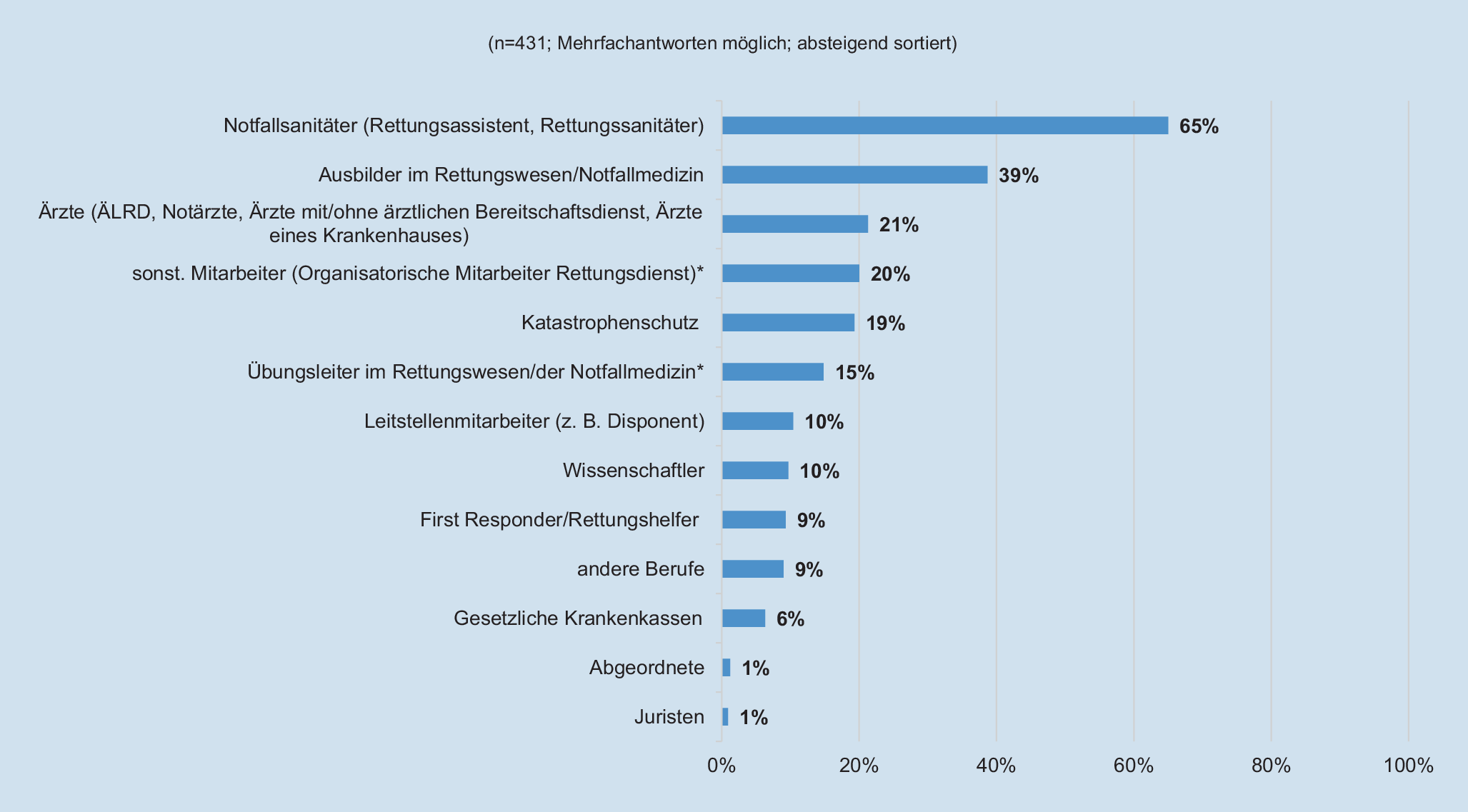 Berufsgruppen der Teilnehmer der Online-Befragung (n = 431; Mehrfachantworten möglich; absteigend sortiert). * „Organisatorische Mitarbeiter RD“ sind bspw. Referenten eines Trägers wie der Malteser etc; „Übungsleiter“ sind u. a. nebenberufliche Ausbilder mit Schwerpunktqualifizierungen