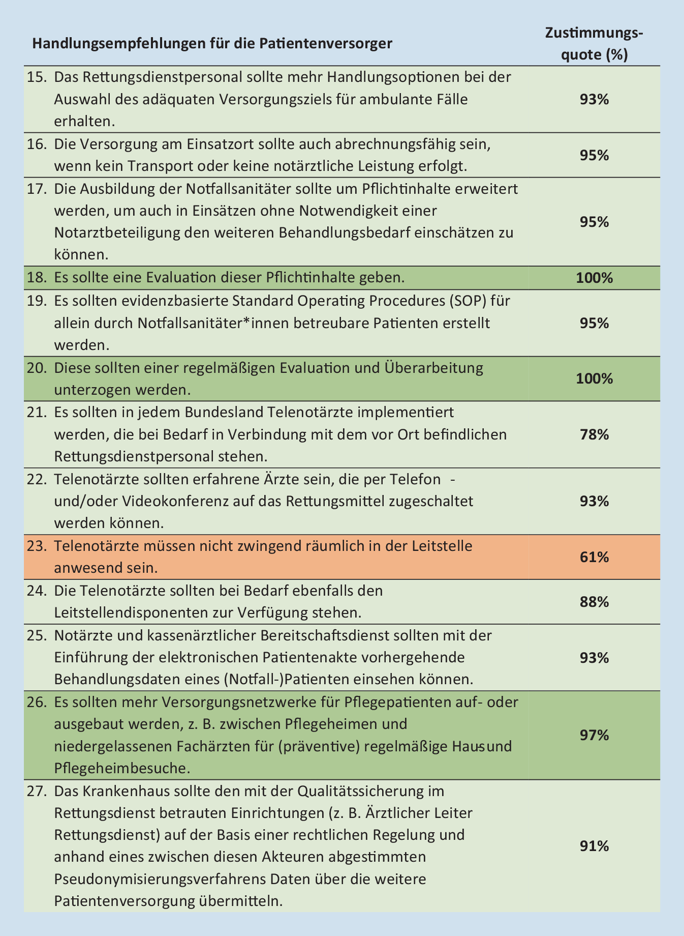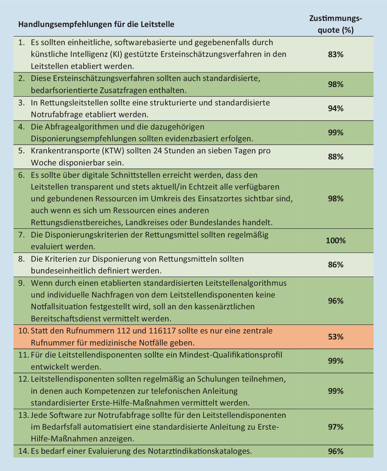 Die Aussagen fanden bei den an der Umfrage teilnehmenden Experten große Zustimmung. Die Empfehlungen sollten im Diskurs zur Organisation und Qualitätssicherung der Notfallversorgung berücksichtigt werden.