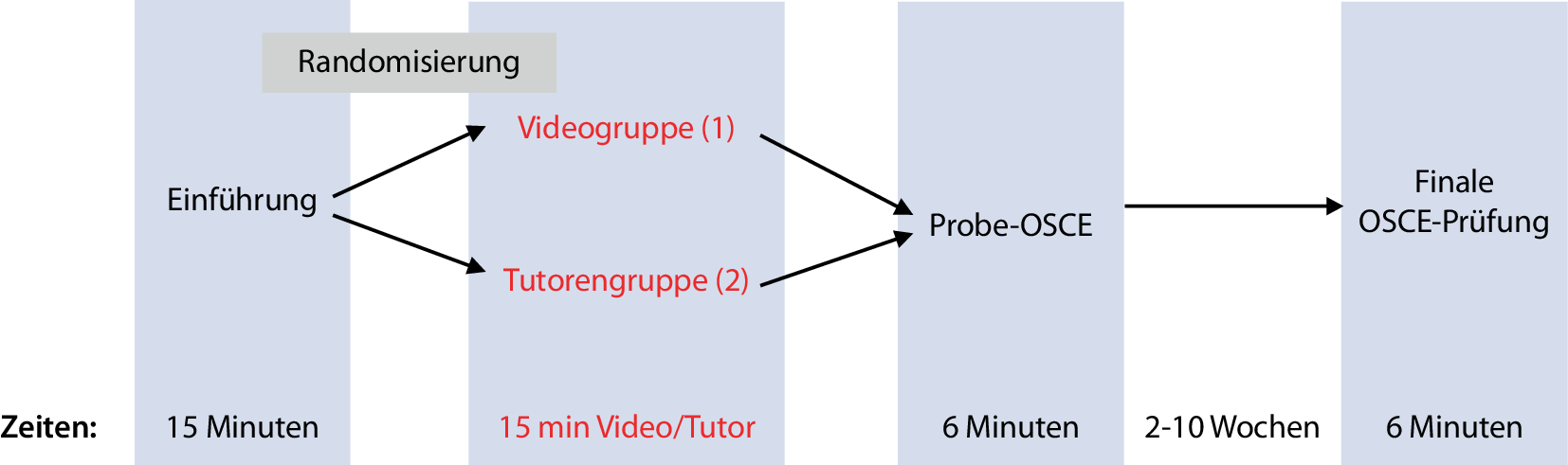 Alle 318 Studierenden konnten den neu implementieren Kurs erfolgreich absolvieren und die Teilnahme an der Studie fand allgemein eine positive Resonanz. Sämtliche OSCE-Prüfungen konnten ohne Zwischenfälle durchgeführt werden. Bei der Probe-OSCE erreichten beide Gruppen ein nahezu gleiches Prüfungsergebnis (Videogruppe 23,4 ± 3,8 Punkte vs. Tutorengruppe 23,4 ± 3,6 von maximal 32 Punkten, p = 0,9; Abb. 2b). Im Vergleich zur Probe-OSCE wurde am Semesterende das Prüfungsergebnis in beiden Gruppen noch einmal signifikant verbessert (p = 0,001), ohne dass dabei signifikante Unterschiede zwischen den zwei Lehrmethoden zu beobachten waren (Videogruppe 25,7 ± 3,7 Punkte vs. Tutorengruppe 25,5 ± 3,6 Punkte, p = 0,5; Abb. 2b).