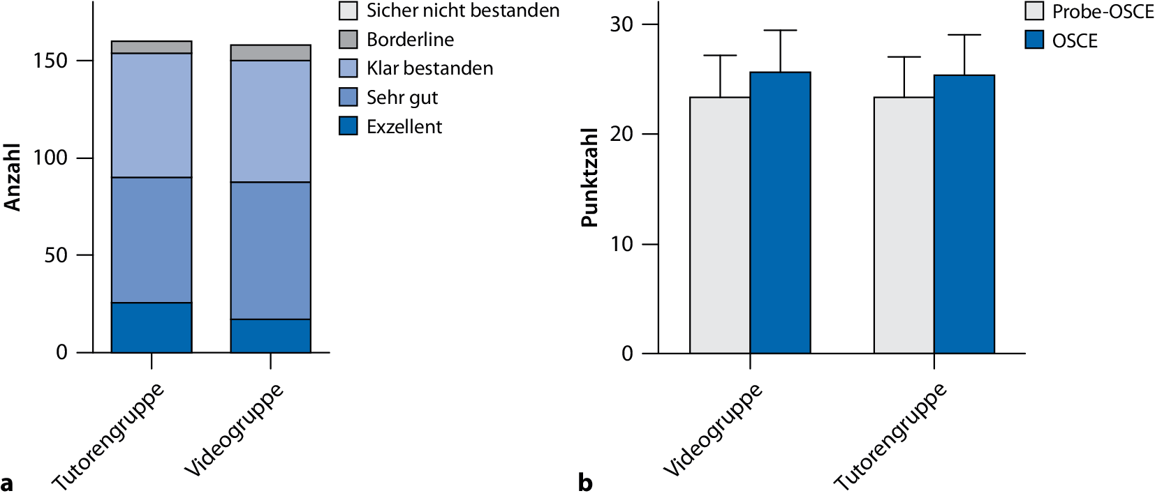 Gemäß dem Global Rating Score, der am Ende der Prüfung durch die jeweiligen Prüfer vergeben wurde (Abb. 2a), wurden die Prüfungen bei über 60 % der Studierenden „exzellent“ bis „sehr gut“ bestanden, und bei über 95 % wurde als schlechteste Einschätzung ein „klar bestanden“ vergeben. Bei nur wenigen Studierenden wurde die Prüfungsleistung als „borderline“ eingeschätzt, keiner der Studierenden hat die Prüfung nicht bestanden (Abb. 2a). Auch hier konnte kein von der Lehrmethode abhängiger Unterschied festgestellt werden.