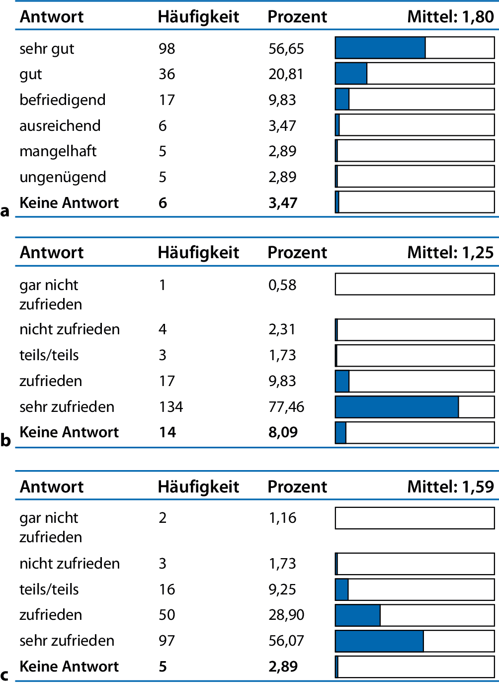 Studentische Evaluation des neu implementierten Kurses am Ende des Semesters. a Wie gut waren Sie auf die Prüfungsaufgaben durch das Blockpraktikum vorbereitet? b Wie zufrieden waren Sie mit den Simulationspatienten? c Wie zufrieden waren Sie mit der OSCE-Prüfungsdurchführung?