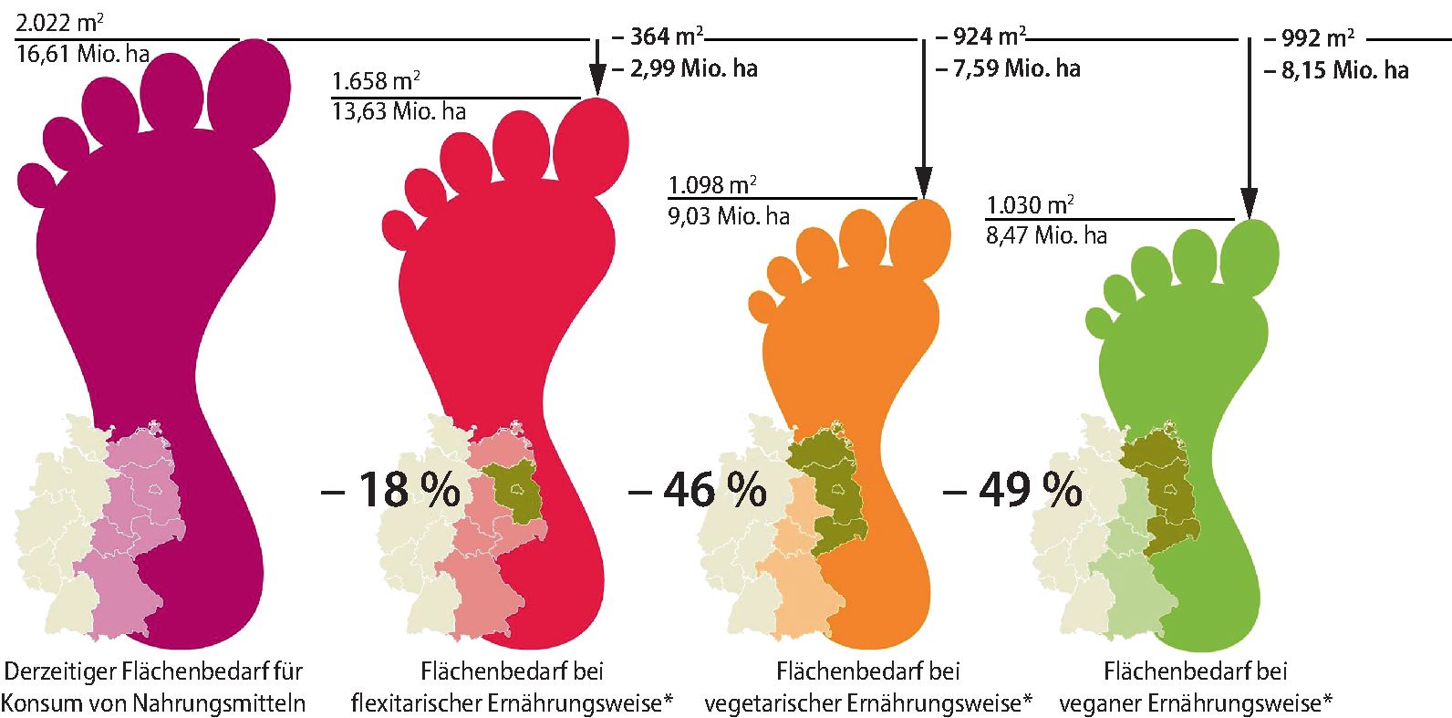 Flächenbedarf für die derzeitige Ernährung in Deutschland im Vergleich zur flexitarischen, vegetarischen und veganen Ernährungsweise in Quadratmetern pro Person und Millionen Hektar