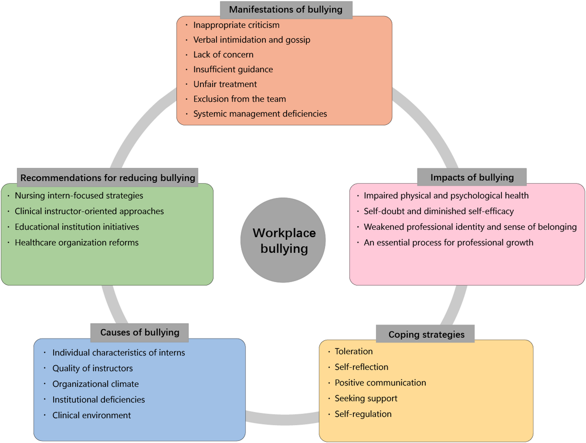 At the nursing intern level, participants emphasized the importance of developing emotional self-regulation, enhancing clinical competence, and adopting effective coping strategies were outlined by Dafny et al. [36], who identified a range of practical responses, including confrontation, seeking support from social networks, consulting instructors, utilizing counseling services, employing self-protective behaviours, reporting incidents to senior staff, and alerting hospital security when necessary. Previous research has also emphasized the importance of enabling students to distinguish between constructive criticism and bullying, analyze feedback objectively, and engage in reflective practice to identify areas for improvement [17]. Moreover, the formation of peer support networks, especially those encouraging experience-sharing and mutual encouragement, is highly effective in reducing the impact of bullying and fostering a more resilient student community [37].