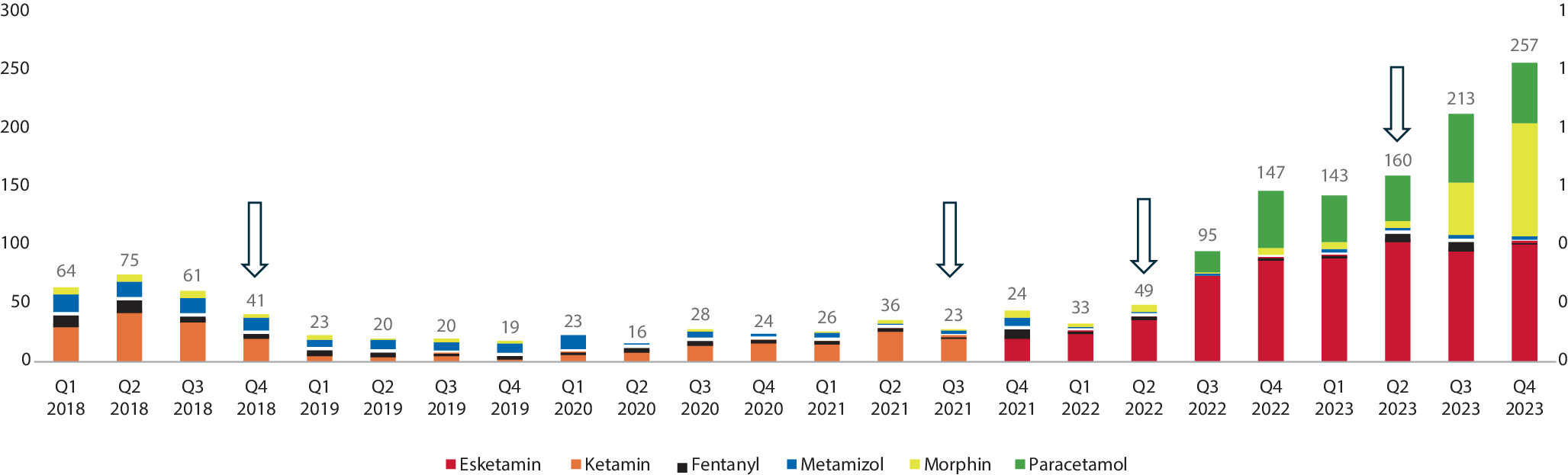 Anzahl der Einsätze mit Analgesie pro Quartal. Der erste Pfeil von links visualisiert den Übergang zum fehlenden Versicherungsschutz. Der zweitePfeil von links zeigt den Wechsel in der Medikamentenvorhaltung (Ketamin versus Esketamin), der dritte Pfeil die Einführung der Vorabdelegation für NotSan in Baden-Württemberg ab Juli 2022 (nach Q2/2021) und die gleichzeitige Vorhaltung von Paracetamol, gefolgt vom vierten Pfeil der Delegation von Morphin ab August 2023