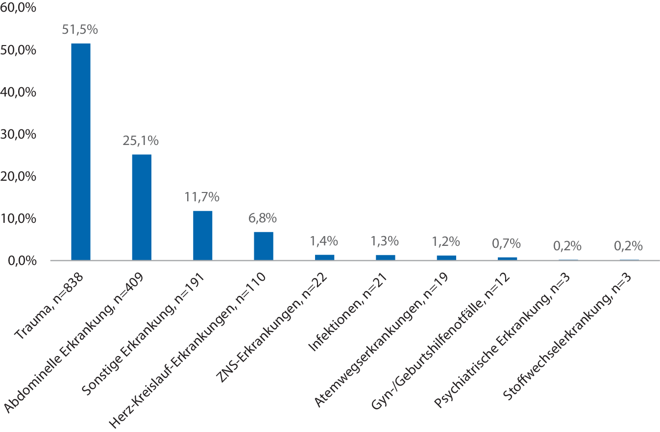 Führende Gründe für eine medikamentöse Analgesie im gesamten Untersuchungszeitraum waren Traumata (51,5 %), gefolgt von abdominellen Beschwerden mit 25,1 % und sonstigen Erkrankungen mit 11,7 %, wovon wiederum 77,1 % (n = 165) auf Lumbalgien entfallen (Abb. 2).