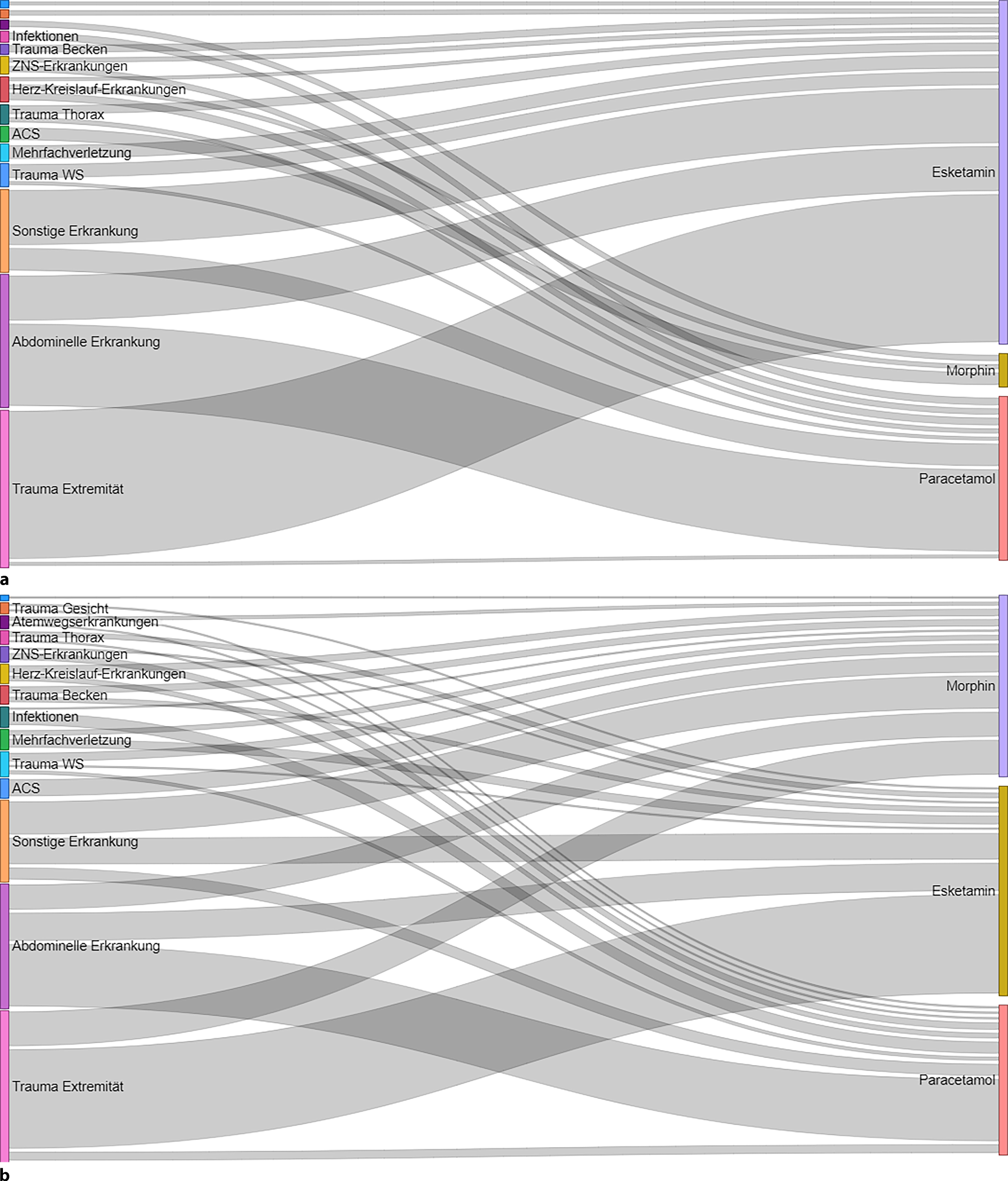 Visualisierung der Analgetikanutzung von Esketamin, Morphin und Paracetamol ein halbes Jahr vor (a) und nach der Einführung (b) von Morphin 2023 in Bezug auf auswertbare Diagnosegruppen mittels eines Sankey-Diagramms