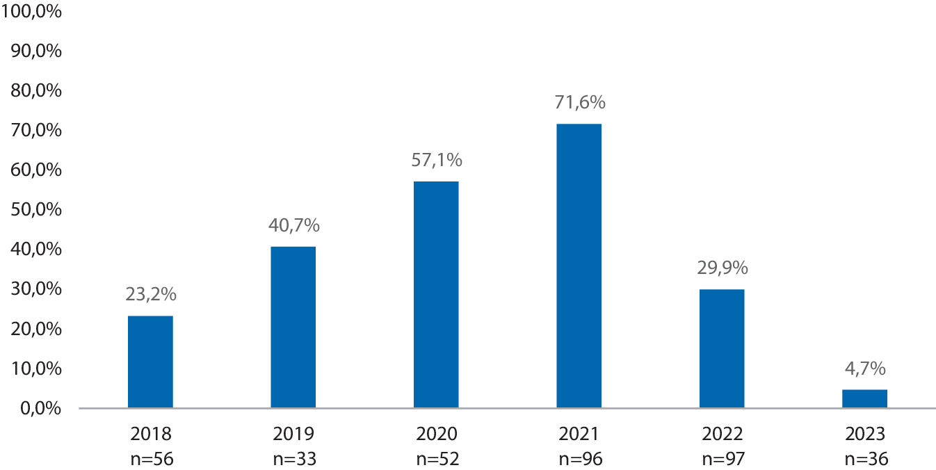 Die Notarztnachforderungen zur Analgesie lagen zwar über den gesamten Untersuchungszeitraum bei 28,1 %, jedoch zeigt sich im chronologischen Verlauf ein Ausgangswert in 2018 von 23,2 %, was bis zum Maximum in 2021 mit 71,6 % einer Zunahme von +208,6 % entspricht. Seit 2021 fallen die Nachforderungen in 2023 auf 4,7 %, was einem Rückgang von −93,4 % entspricht (Abb. 5).