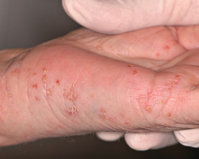 Das klinische Bild der Skabies variiert erheblich, abhängig von der Milbenzahl, vom Alter, Immunstatus und Abwehrverhalten des Patienten sowie von der Vorbehandlung. Warme Körperregionen und solche mit dünner Hornschicht werden bevorzugt befallen: Interdigitalfalten und Seitenkanten von Händen (Abb. 1) und Füßen, vordere Axillarfalten, Brustwarzenhof, Nabel, Genitoanalregion, Leisten und Knöchel.