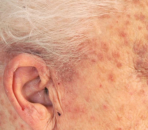 Die Heterogenität der klinischen Erscheinungsbilder der Skabies und die Vielzahl mit Juckreiz einhergehender Dermatosen im Alter bedingen eine breite Differenzialdiagnose. Das klinische Bild kann bei alten Patienten erheblich modifiziert sein, mit stärkerer und weniger typischer Ausprägung, markantem Befall des Rumpfes sowie Beteiligung von Kopf (Abb. 2), Palmae und Plantae. Intensive Körperhygiene ("gepflegte" Skabies) oder Vorbehandlung mit Kortikosteroiden ("Scabies incognito") bewirkt diskretere und weniger entzündliche Erscheinungsformen. Als Ausdruck einer verstärkten Entzündungsreaktion können erythematöse Knoten entstehen (Scabies nodosa), die an eine Prurigo nodularis erinnern. Sie bilden sich auch nach erfolgreicher Therapie nur langsam zurück. Blasen treten nur ausnahmsweise auf (Scabies bullosa), erschweren dann aber die Unterscheidung von einem bullosen Pemphigoid. In einer prospektiven Studie zur Skabies in britischen Altenpflegeheimen wiesen 57% der Betroffenen klinische Zeichen der Infektion nur in bekleideten Körperregionen auf; die Hälfte der Patienten gab keinen Juckreiz an. Milbengänge waren nur in 41% der Fälle identifizierbar. Als einziger Risikofaktor wurde eine Demenz identifiziert.