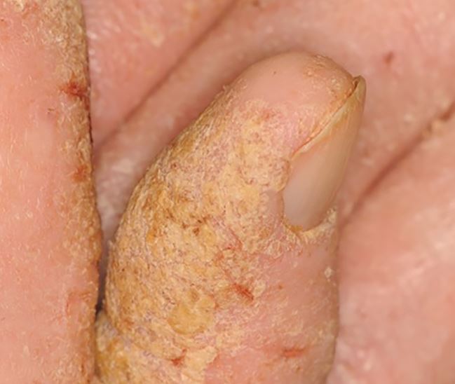 Scabies crustosa bei einer 80-jährigen Patientin. Daumen mit borkigen Krusten und Rhagaden.