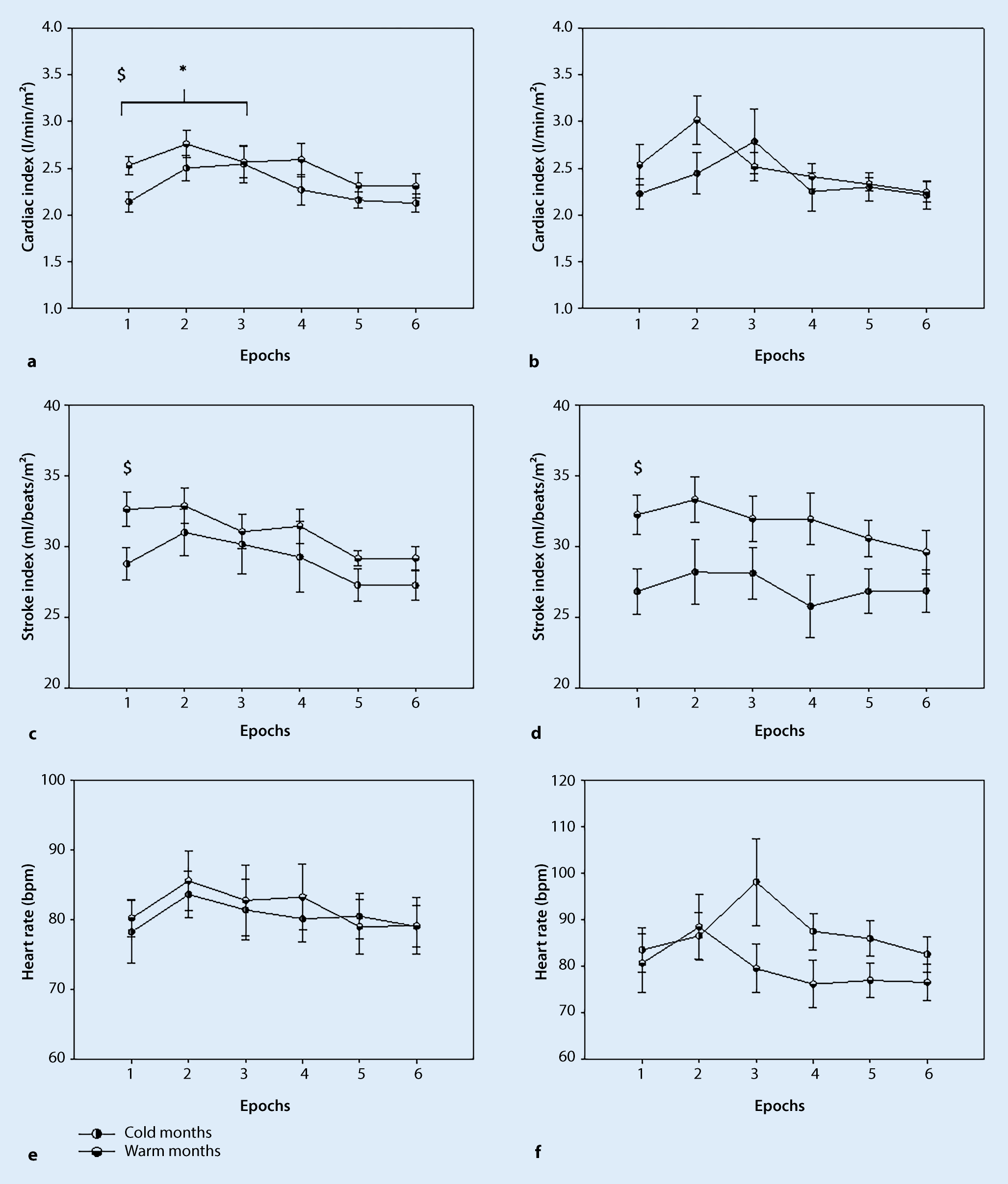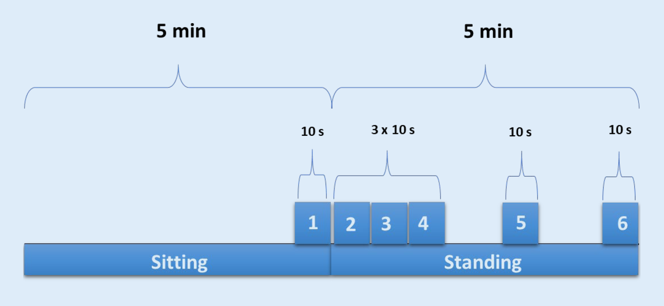 Hemodynamic responses were assessed in both groups during a sit-to-stand test (5 min sitting followed by 5 min standing) beat to beat within two different seasons. Systolic blood pressure (SBP), diastolic blood pressure (DBP), mean blood pressure (MBP), heart rate (HR), stroke index (SI), cardiac index (CI) and heart rate variability (HRV) were continuously monitored.