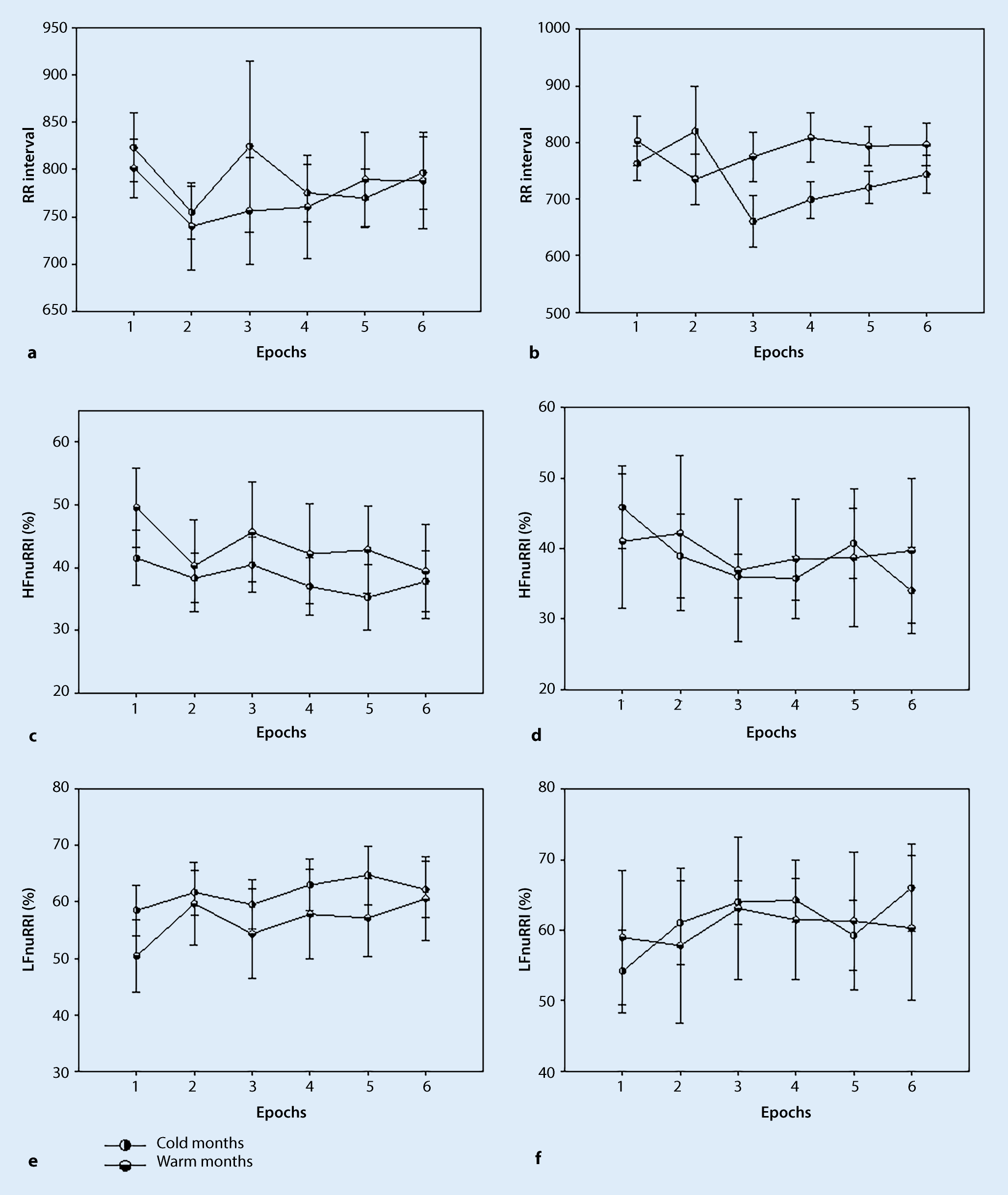 * significant time interaction between baseline and 2–6 epoch in warmer months. Values are mean and (±SE)