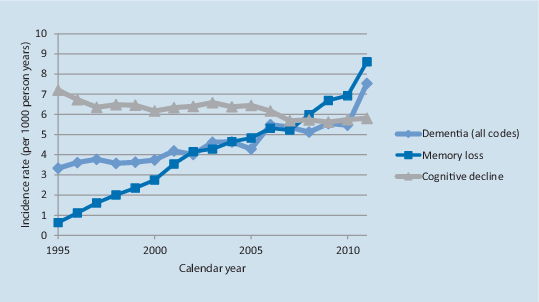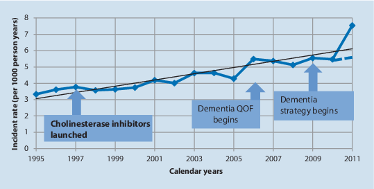 Incident rate of dementia in the THIN database 1995–2011 (QOF Quality and Outcome Framework)