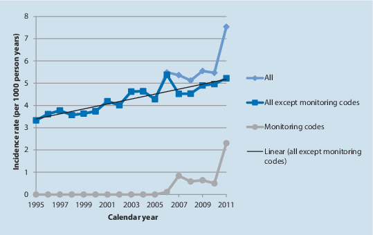 The financial incentives introduced in 2006 did appear to change the way in which encounters with people with dementia were documented in the electronic medical records (see Fig. 2); a code for ‘dementia monitoring’ was used more often after 2007, with a slight decline in use during 2008–2010 until the sudden but artefactual increase in 2011.