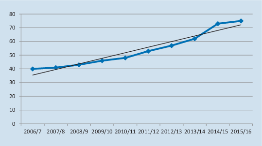 A similar pattern of slow, steady increase with no interruptions attributable to education, contract change or policy pressures is visible in the prevalence data (reported as numbers with dementia per 1000 population), shown in Fig. 4. This data is derived from the UK Health & Social Care Information Centre [10]. In 2013 the UK Alzheimer’s Society estimated the population prevalence of dementia as 1.3% whilst these data suggest a prevalence of 0.4% in 2006/2007 and 0.73% in 2014/2015.