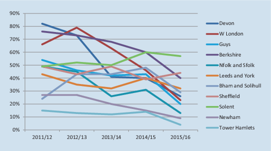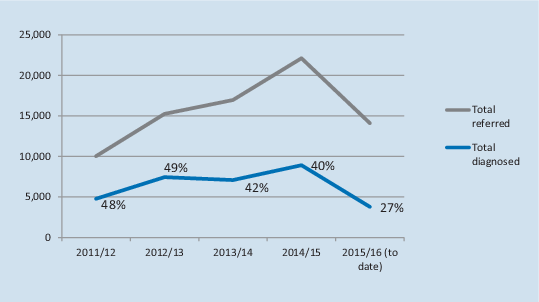 There is some evidence that memory clinics are diagnosing fewer cases of dementia. Data obtained from a Pulse magazine Freedom of Information request in February 2016 are shown in Fig. 5. The proportion of those referred to the 11 clinics from which data could be obtained who received a diagnosis of dementia declined between 2011/12 and 2015/16 in all but two clinics. Fig. 6 shows the actual numbers of referrals, and the average proportions receiving a dementia diagnosis.